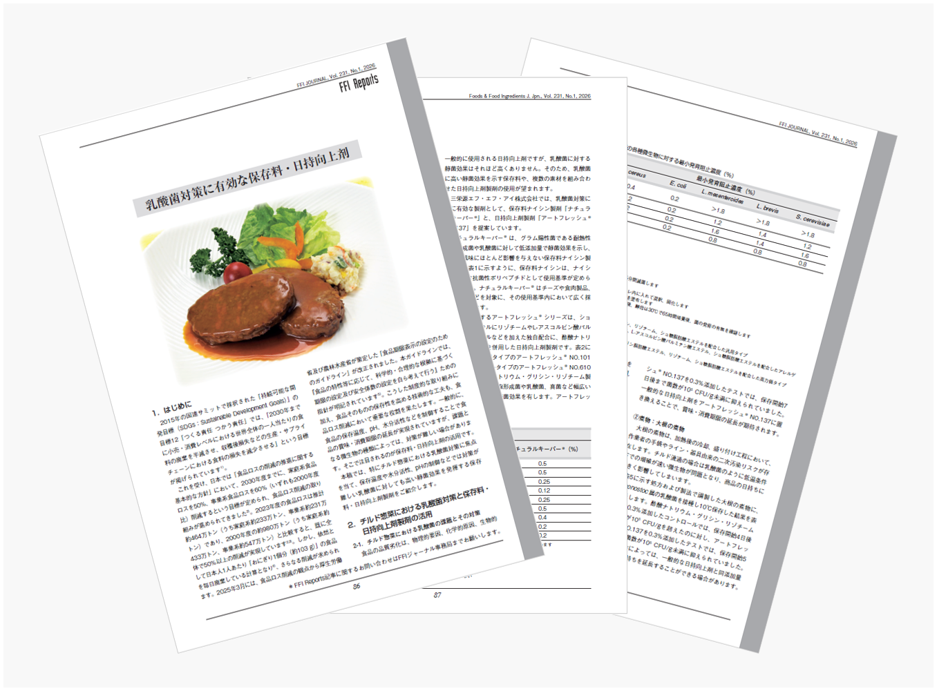 チルド食品における乳酸菌の二次汚染リスクに対応するため、食品の風味を損なわずに高い静菌効果を発揮する保存料ナイシン製剤「ナチュラルキーパー®」(使用基準あり)と、幅広い微生物に有効な日持向上剤製剤「アートフレッシュ® NO.137」を紹介しています。
